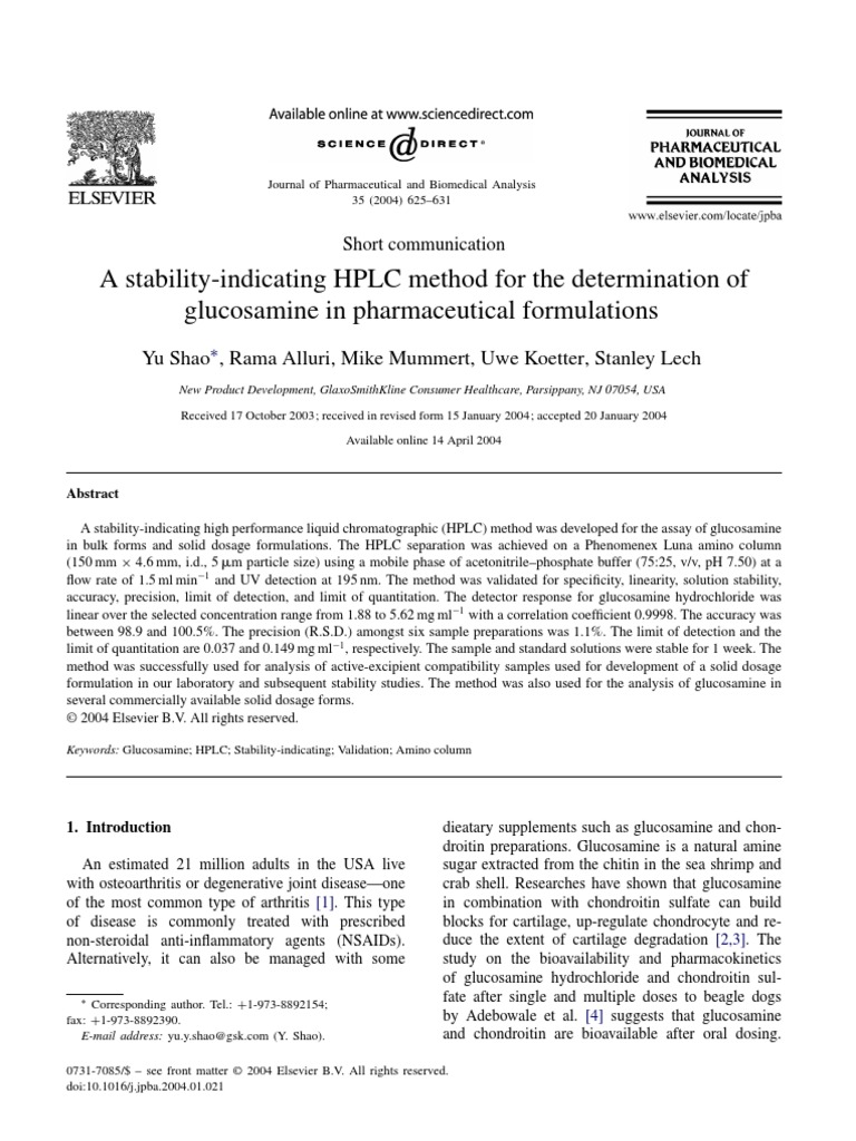 논문 A stabilityindicating HPLC method for the determination of glucosamine in pharmaceutical